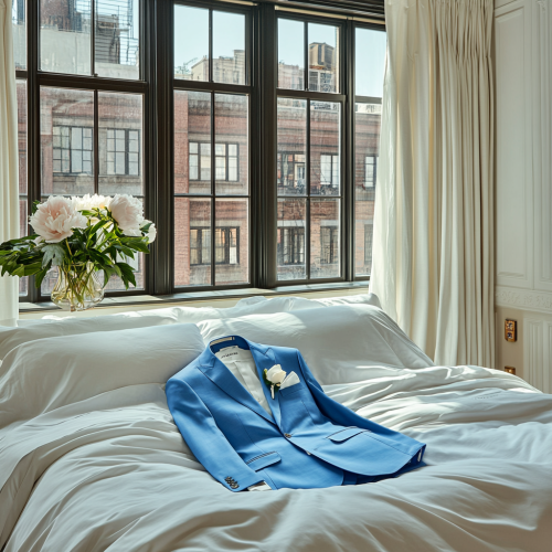 a bespoke bright blue men's suit is laid across a plush king size bed with white sheets. There are many windows in this large bright room, and there is a peony flower on the top left pocket of the suit on the bed in the middle of the room