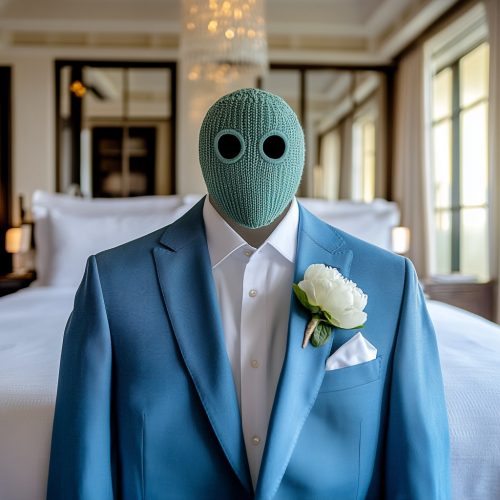 a bespoke bright blue men's suit is laid across a plush king size bed with white sheets. There are many windows in this large bright room, and there is a peony flower on the top left pocket of the suit on the bed in the middle of the room. A knitted, bright green ski-mask (with the typical 3 holes) is laid down flat on the bed, at the top of the suit, to make it look like a full deflated person.