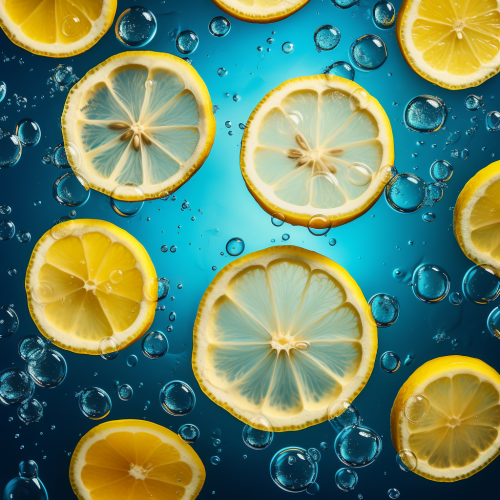 Bright citrus lemon slice in sparkling water, cinematic lighting.