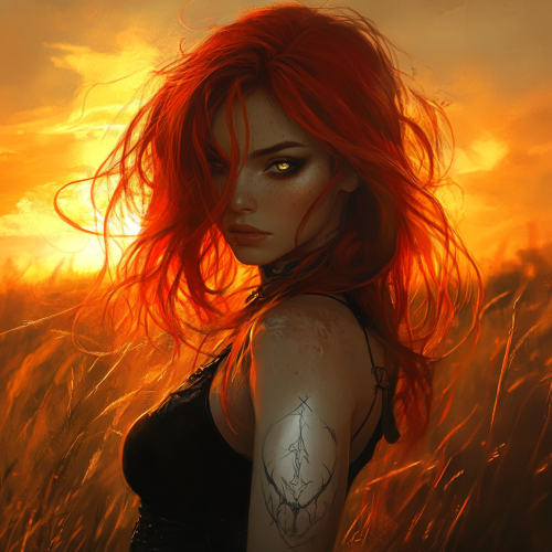 fanatsy character. Bright red hair. Eyes the colour of fire. White tattoo on her arm. Standing in the middle of a field with the power of the sun behind her.