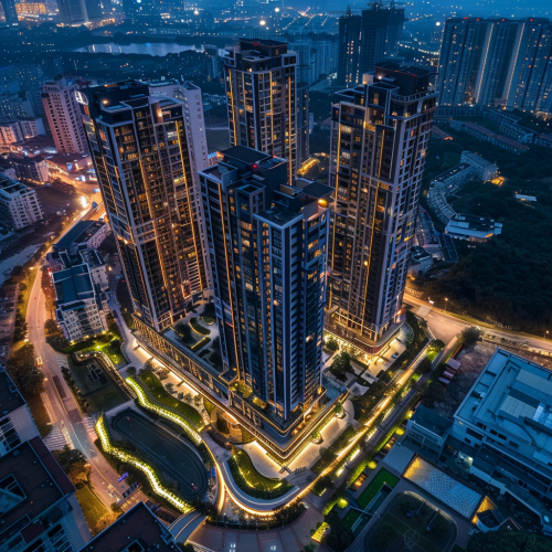 aerial photography of a 3 tower, 19 storey highrise apartment complex with central podium on first floor, Master plan, Architecture photography, twilight sky, Late evening, highly detailed, golden ratio, 4k.