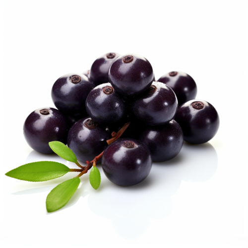 hyper realistic photo of dragon fruit, cut in half to show inside texture, positioned next to Acai berries. Beautiful colors, fresh looking, bright. On a white background