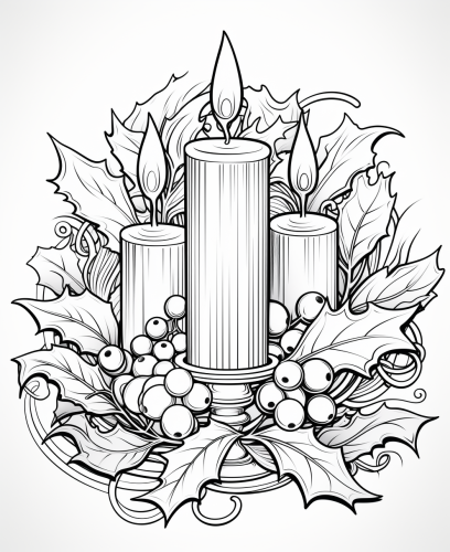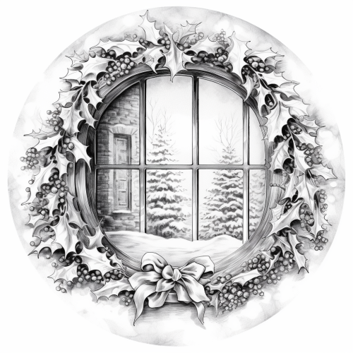 a holly wreath on the frosted window, winter atmosphere; ink drawing on white background, cinematic, detailed