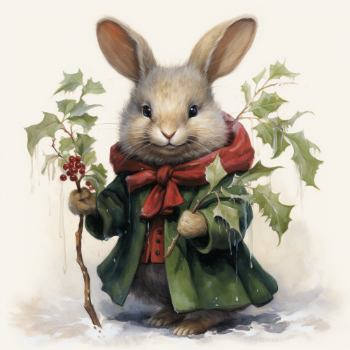 adorable very happy female rabbit dressed in a beautiful velvet coat,carrying beautiful green holly with red berries and Christmas branches, on a snowy background, jean - baptiste monge , Beatrix potter, smooth, anthropomorphic