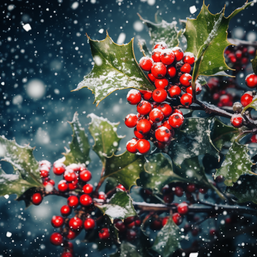 Envision and craft a captivating and magically minimalist illustration against a sumptuous dark green background. Weave enchanting, feminine Christmas elements in red, white, and gold as if they were born of fairy tales. Think of subtle holly berries shimmering with an otherworldly glow, garlands gracefully appearing with a wave of a magical wand, and tasteful gold accents that sparkle like stardust.