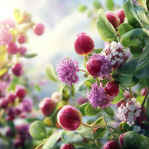 An ultra-realistic 8k photo featuring a combination of Red Clover flowers and Schizandra berries, meticulously detailed to showcase their natural beauty. The Red Clover flowers, with their delicate pink petals, are paired with glossy, vibrant red Schizandra berries, creating a harmonious and visually striking composition. These natural elements are set against a vibrant orange background, which provides a bold and eye-catching contrast. The soft, warm lighting enhances the colors and textures, making the image feel fresh, inviting, and full of life. The overall style is bright and consistent with the organic, vibrant aesthetic, highlighting the health and well-being benefits of these natural ingredients.