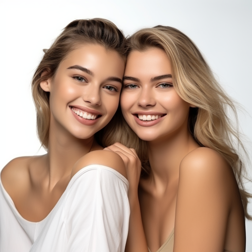 clear skin on a woman as she looks in the mirror with a smile, modern, photorealistic