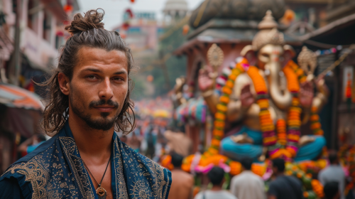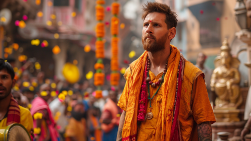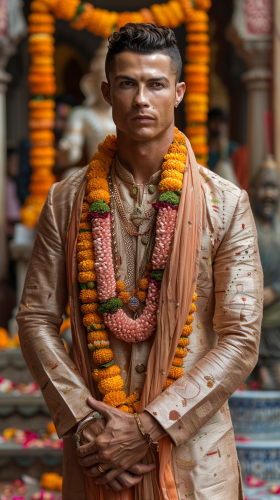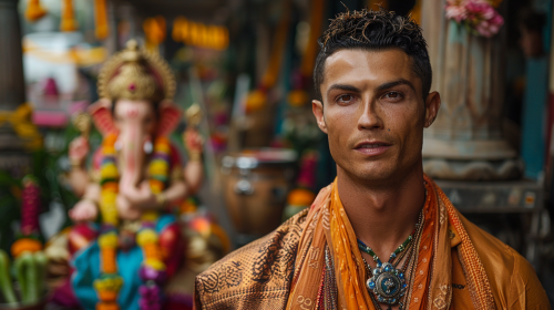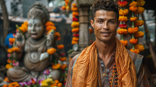 Cristiano Ronaldo, in India, standing in traditional Indian attire (kurta and dhoti), observing the vibrant Ganesh Chaturthi festival around him. A large Ganapathy (Ganesha) idol statue is prominently behind him, adorned with flowers and decorations. He is surrounded by colourful festival elements, with people celebrating joyfully. Ronaldo looks on with a smile, appreciating the lively and spiritual atmosphere --ar 9:16 --v 6.0 --style raw --s 750