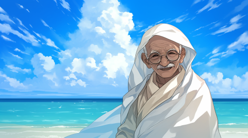 an elderly Mahatma Gandhi poses for a picture wearing a white robe, he has brown skin and wears glasses, he is in India standing on a beach, anime style, high-definition