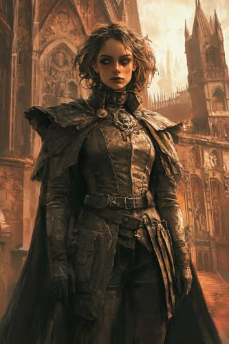 a full body shot of a female skinny grimdark government administrator. She wears a scruffy grimdark uniform with a cape. In the background is a gothic grimdark admin building. digital painting --ar 2:3 --v 6.1 --no marine