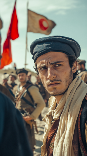 9. to whom their lives had been promised, an emotional scene of prisoners looking at French officers, 1799, Ottoman military attire, on a sandy shore, French flags and soldiers in the background, medium shot focusing on the expressions of fear and disbelief, hyper-realistic, photo realism, cinematography --ar 9:16