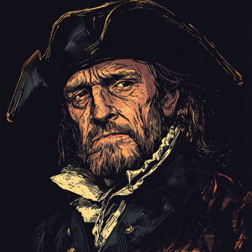 17th century british caribbean governor, portrait, sad hopeless anguished look, portrait, flat colors, ink drawing, 80s style, low resolution, strong shadows, rough lines, high contrast, black palette, low saturation, vintage colors, retro, flat shading, flat coloring, simple, flat vector art