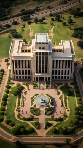 government building in eswatini, surrounded by grass, view from a height, realistic, photography, --ar 9:16