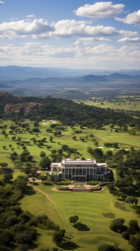 government building in Eswatini, surrounded by vast green fields of grass and trees, view from a height, realistic, photography, --ar 9:16