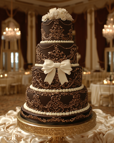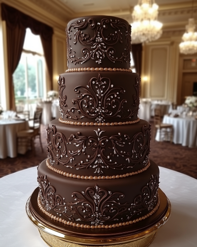 Create an exquisite and stunningly beautiful wedding cake design. This cake is multi tiered barrel shaped and very tall Victorian design inspiration. The base color is chocolate. Chocolate Royal Icing and filigree and Paisley and swirl designs. Rhinestones and gems. The cake sits on a gold pedestal cake stand on a dessert table in a ballroom.The table has ruffled tablecloth. There are beautiful layers of swag curtains. There is excellent lighting on the cake and the room. --ar 4:5 --v 6.1 --stylize 500