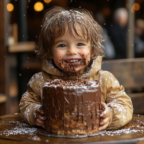 create an editorial photograph for a magazine of a kid eating a huge chocolate cake slice, sitting on an outdoor wood table on an italian restaurant, the kid is happy and filled with chocolate all over his face --s 750