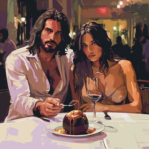 a british 40 year old next to a long haired chubby 30 year old at a five star dining establishment enjoying a chocolate lava cake sphere in the style of grand theft auto --v 6.0