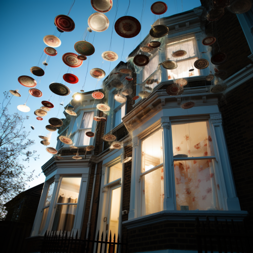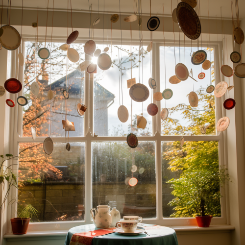 art instalation of plates dangling from the ceiling on string infront of the window of a british home from the point of view through the window onto the street
