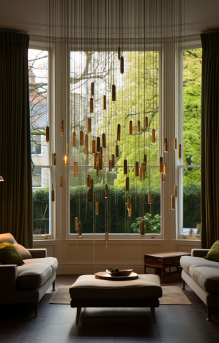 An art installation of 6 thin chains hanging from the ceiling in front of the window of a british home, in a modern living room, from the point of view through the window looking out onto the street, --ar 9:14