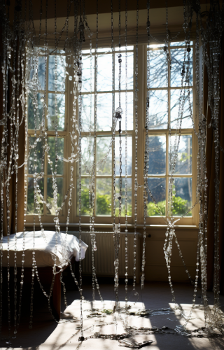 An art installation of chains hanging from the ceiling in front of the window of a british home, in a modern living room, from the point of view through the window looking out onto the street, --ar 9:14