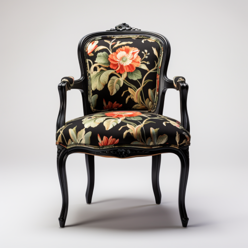 french dining cjairs, french chairs black ebony wood, black glass top, plush seating, floral gucci fabric, studio shoot with luxury flair, single object (only the chair), photorealistic, vintage finish photo, ultra HD, white background studio shoot for product
