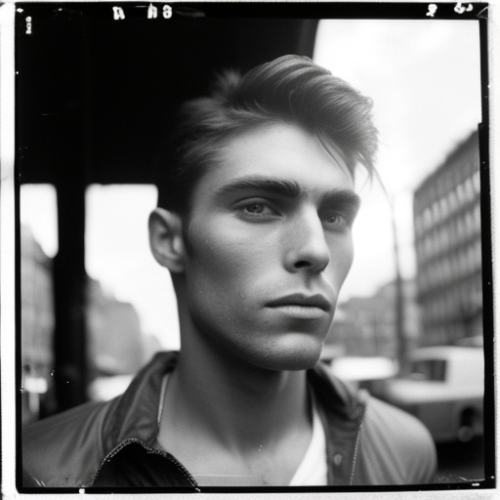portrait of beautiful scally lad in New York's streets, clear facial features, cinematic, black and white ,35mm lens, f/1.8, Accent Lighting, Global Illumination,Polaroïd, --uplight --v 4 --s 750