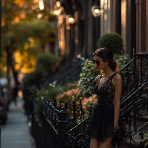 vibrant outdoor setting on a classic New York City street with elegant brownstone buildings and subtle greenery, morning light adding warmth, the background slightly blurred to capture the energy and sophistication of the city without detracting from the model.