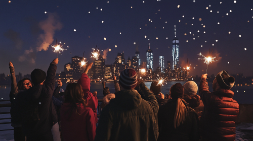 photo of group of friends celebrating at night with new york skyline in the background, some of them are holding sparklers, all of them are facing the skyline, very realistic, Canon EOS 5D Mark IV DSLR, f/5.6 aperture, 1/125 second shutter speed, ISO 100 --no alcohol --ar 16:9 --v 6.1