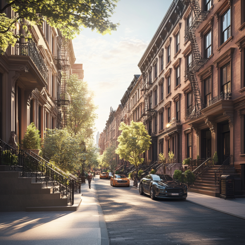 Middle of a bustling New York street with elegant brownstone buildings on either side, soft natural light, slightly blurred background capturing the city’s energy, subtle luxury urban vibe for product mockups.