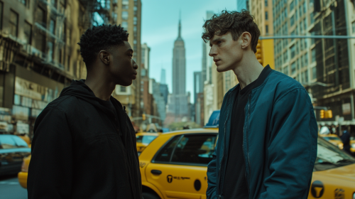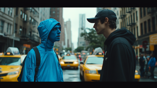 white man wearing all black asking a white man wearing a strange bright blue outfit, close up shot chest up of the men, behind is yellow cabs and the New York City skyline, during the middle of the day --ar 16:9