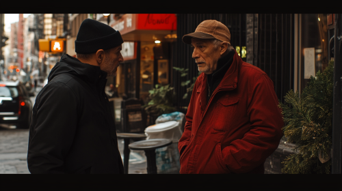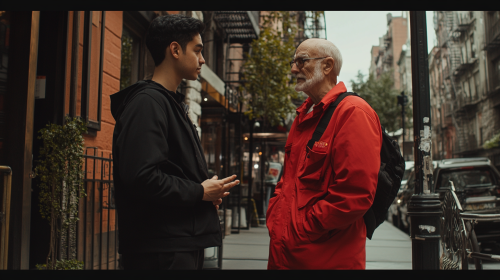 a man in all black asking an old new york man in all red, close up shot chest up of the men both standing up, behind is a simple restaurant with minimalstic vibes and some green in New York, during the middle of the day --ar 16:9
