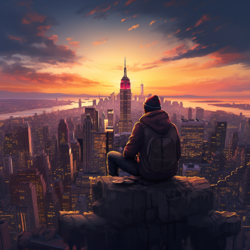 a guy sitting by the edge of the empire state building watching the new york city up top looking down the city + sunset + spiderverse theme + by the side of the guy + long distance