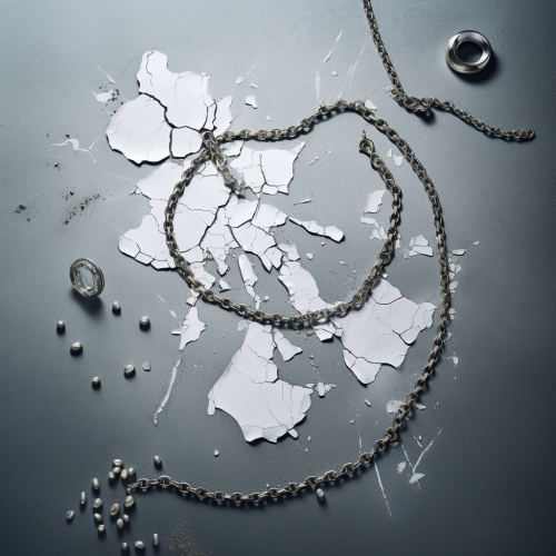 Create an image depicting a broken silver necklace laid out on a bright surface, capturing the moment of damage.