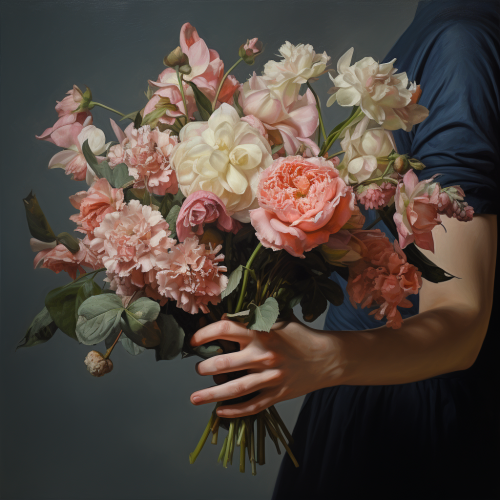a bouquet of chrysanthemums, lilys, orchids, dahlias, and alyssums, with a cute pup smiling behind bouquet, soft pink background, shot on leica SL camera --ar 3:4 --v 6.0