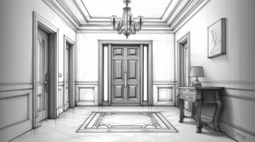 black and white sketch of a closed door in the entrance hall of a house, clear outline --no smudge --v 5.1 --ar 16:9
