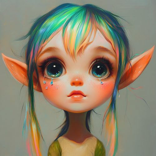 Create a stylized, whimsical portrait of a character with an oversized, doll-like head and large glossy, black eyes. The character should have pastel-colored rainbow hair, blending vibrant shades of blue, green, and orange. Their face is soft and smooth with an innocent, wide-eyed expression, featuring delicate elf-like ears and a small, slightly open mouth. Add subtle translucent teardrops on the cheeks for a dreamy, emotional effect. The overall color palette should be soft and pastel, with a focus on gradient hair tones. The lighting should be soft, giving the character a glowing, ethereal quality. The style should be highly polished and surreal, with a cute yet slightly melancholic vibe, resembling digital art or 3D animation.