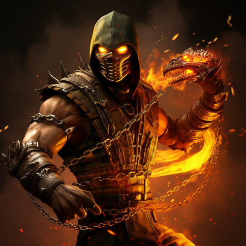 bender futurama as mortal kombat character Scorpion, in rage, head is on fire, throwing kunai spear attached to a chain from wrist