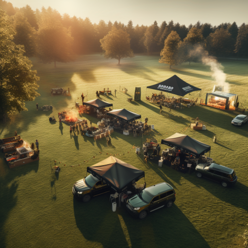 ford bronco event in a field with 30 vehicle sparked, popup tents, bbqs, firepits, outdoors, view from above, the ambiance is spring, forest, dirt, ("EVENT") logotype