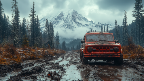 ford bronco vehicle event, outdoors, view from above, the ambiance is spring, forest, dirt, overlay the word EVENT