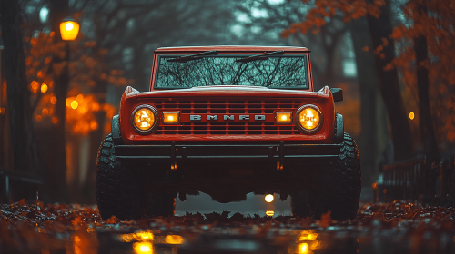 photo of white a Ford Bronco fiew from front angle, reflection paint, in london, at night, shot on a Sony mirrorless camera, DSLR, 50mm lens f/2.8, ultra detailed, 8k, --ar 16:9 --v 6.1 --s 750 --style raw