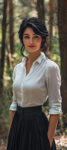 A professional-style, slim-fit white long-sleeved shirt for women, paired with a black skirt. The minimalist design features a clean background and solid color. The portrait photography captures a smiling face, with hands folded in front of the chest, showcasing the full-body attire