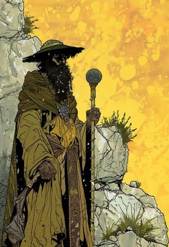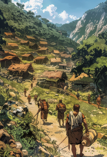 Bronze Age proselyte spreading mystical information. Comicbook style art --ar 11:16
