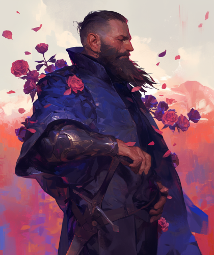 a girl with a long brown beard in a blue jacket with flower petals, in the style of goblincore, 2d game art, helga ancher, shilin huang, light bronze and red, witchcore, loose, painterly style --ar 43:51 --niji 6