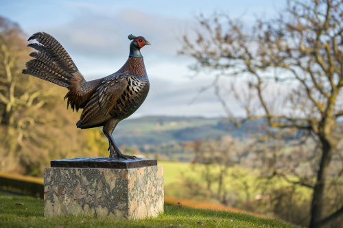 a 10 metre tall bronze patina statue of a Pheasant, on a marble base, on a grassy plain --ar 3:2
