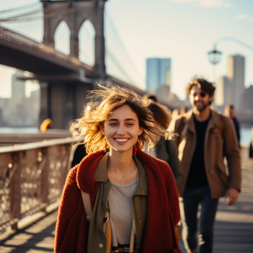 the sunny skies of Brooklyn in the background. happy people in their early 20's walking along the bridge long shot, 2020 style, fashion style photograph, colour, soft glow, super resolution, bokeh, film, Kodak, shot with Leica m10, 24mm Noctilux 0.95 lens, futuristic, cinematic, colour grading, intricate details, high resolution, sharp, long shot, day light, wide angle