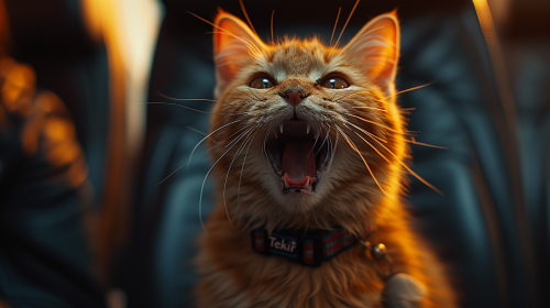 Imagine an engaging image that As the plane takes off the brown colored cat sitting on the seat panics and screams its owner tries to calm it down ,detailed brown cat, The cat has a collar around its neck, brown cat , word "Tekir" written on the collar , full body, hdr, color grading, real photo ,64k, ultra detailed, detailed face, wtihe european, Photorealistic, commercial photography, Sony A7R --ar 16:9 --s 750 --v 6.0 --style raw