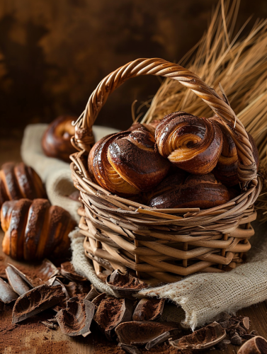 cocoa rolls in a basket, photo art for bakery, lots of cocoa --v 6.0 --ar 3:4