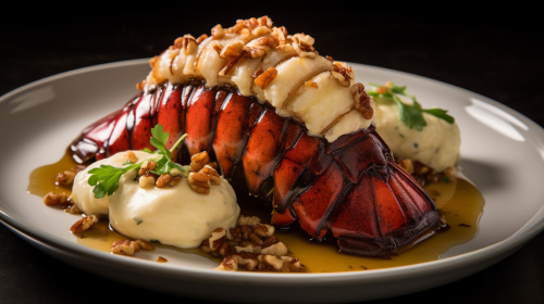 The finest lobster tail on the market, poached in a nutty brown butter and served with a decadent symphony of roasted hazelnuts and a side of whipped brown butter-infused potatoes. highest quality image resolution --ar 16:9