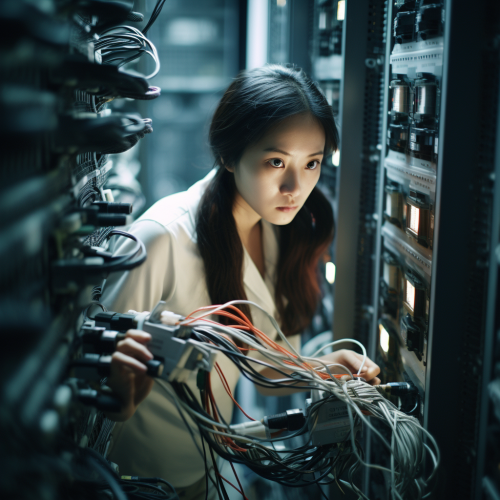 A high-tech server room filled with rows of sleek, glowing servers, cables meticulously organized, soft blue and green LED lights illuminating the space, capturing the essence of modern data storage and processing, Photography, Nikon D850 with a 24-70mm lens at f/2.8, --ar 16:9 --v 6.0 --style raw --s 750