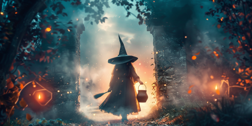 Beautiful witch with pointed hat holding a broom in front of her a cauldron, very bright image, captured by Canon EOS R camera with a 50mm f/ 1. 8 lens, f/ 2. 2 aperture, shutter speed 1/ 200s, ISO 100 and natural light, Hyper - Realistic Photography, Hyper detail, UHD, Color Correction, hdr, color grading, hyper - realistic photograph. --ar 2:1 --v 6.0